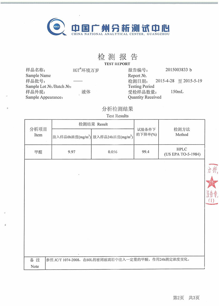 • 中國廣州分析測試中心甲醛分解測試報告